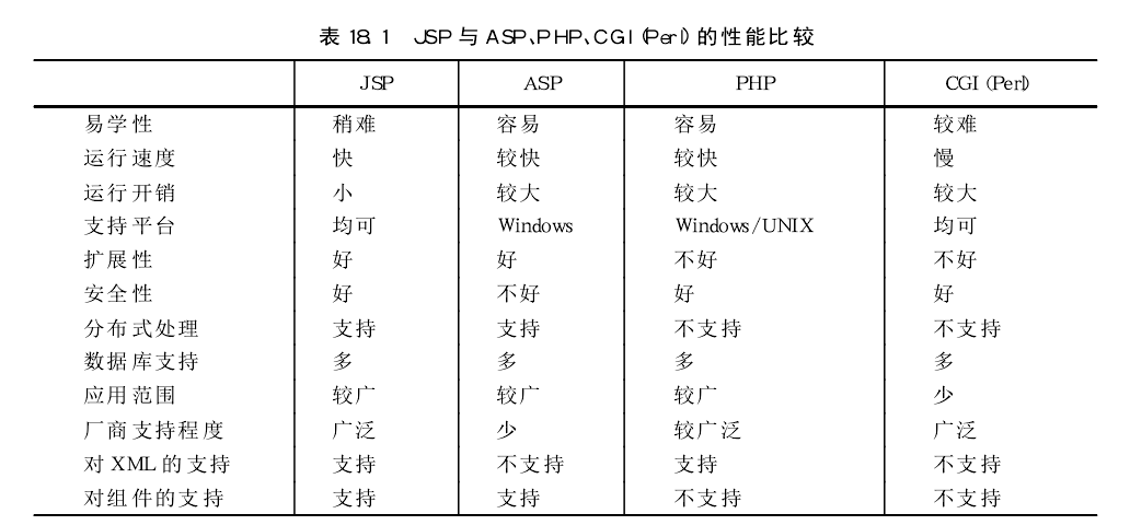 为简明起见,下面将JSP与ASP.PHP、CGI(Perl)的性能作一归纳比较,如表所示。