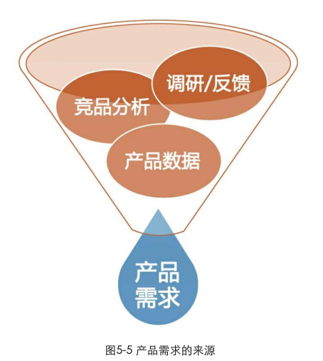 在实际项目中,采集需求的主要方式有用户调研、竞品分析、用户反馈(上线后)、产品数据(上线后)等,如图5-5所示。这些方法都是产品经理和设计师需要密切关注的。