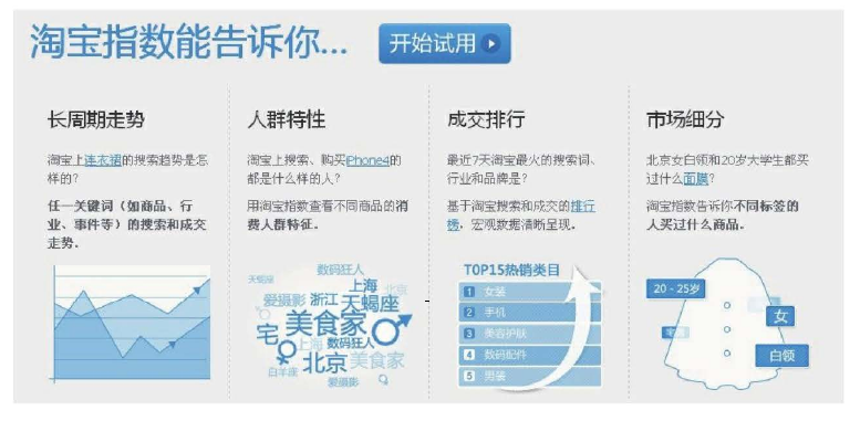 还可以试试百度指数、淘宝指数等工具,它们可以告诉你目前的搜索热词、搜索词对应的用户特征、各项数据指标等,非常实用,如图5-6所示。