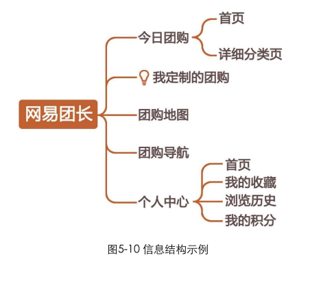 信息结构:这里可简单理解为内容或页面的层级,如图5-10所示。可以由设计师和产品经理配合完成,也可由产品经理独立完成,设计师做参考用。