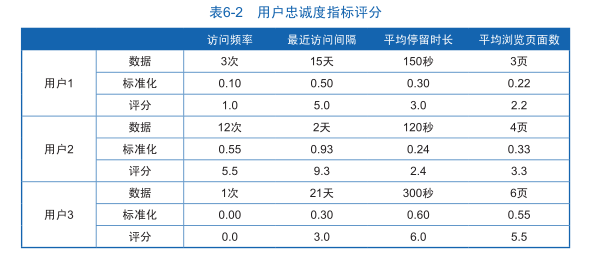 表6-2中,用户忠诚度的4个分析指标经过标准化处理后统一以10分制的形式输出,这样就能直接区分每个用户的每项指标的表现好坏。基于每个指标的评分,可以对用户进行筛选,比如营销部门重点跟进经常访问网站的用户,可以选择访问频率评分大于3分的用户,或者重点跟进用户访问参与度较高的用户,可以筛选平均停留时间和平均访问页面数都大于3分的用户,这样能够帮助营销部门迅速定位忠诚用户。
