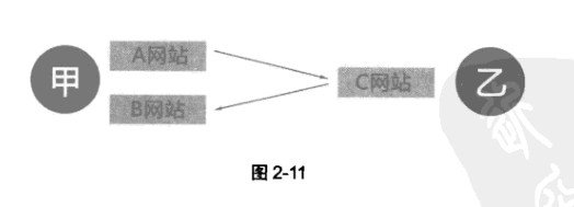 第二种是双方共拥有三个网站:甲方拥有A、B两个网站,乙方拥有C网站,则甲方用A站链接乙方的C站,乙方用C站链接甲方的B站(如图2-11所示)。