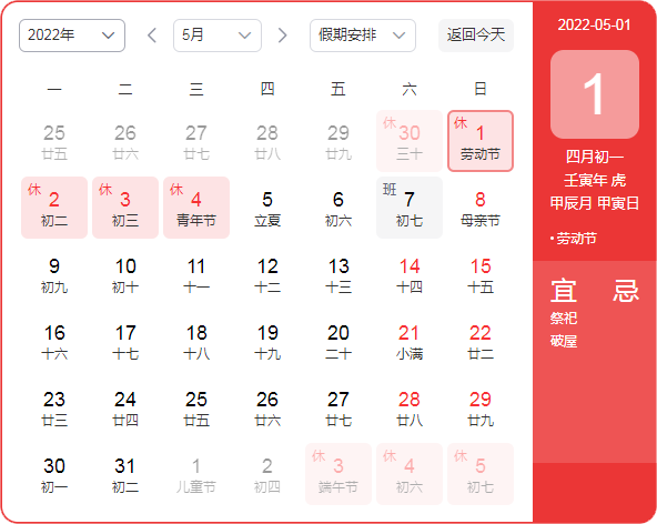 放假时间:2022年4月30日(周六)——2022年5月4(周三),共5天。