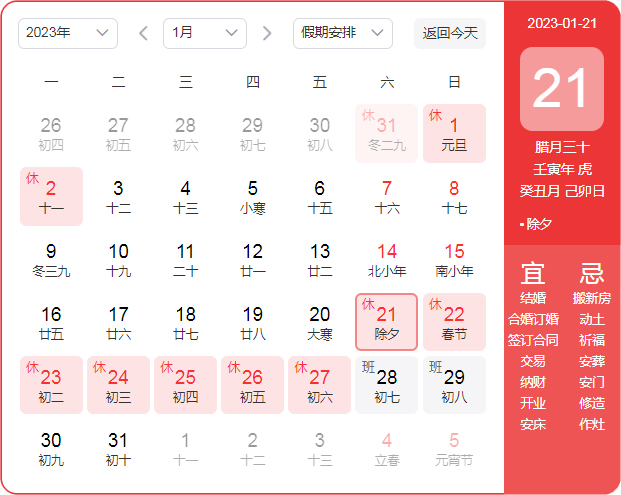 放假时间:2023年1月21日(周六)——2023年1月27日(周五),共七天。